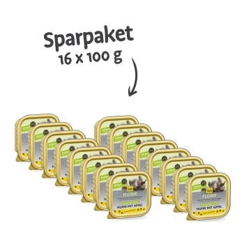 FLORIE Kitten Huhn mit Apfel enthält besonders viel frisches Hühnerfleisch. Das zarte Geflügelfleisch ist leicht bekömmlich und schmackhaft zugleich. Das hochwertige Protein des Geflügelfleisches bietet so eine gute Verdaulichkeit. Zudem fördert der hohe Proteingehalt das Wachstum der Kitten: Zur Entwicklung von Muskeln, Sehnen und Knochen benötigen die Jungtiere eine optimale Eiweißversorgung.
